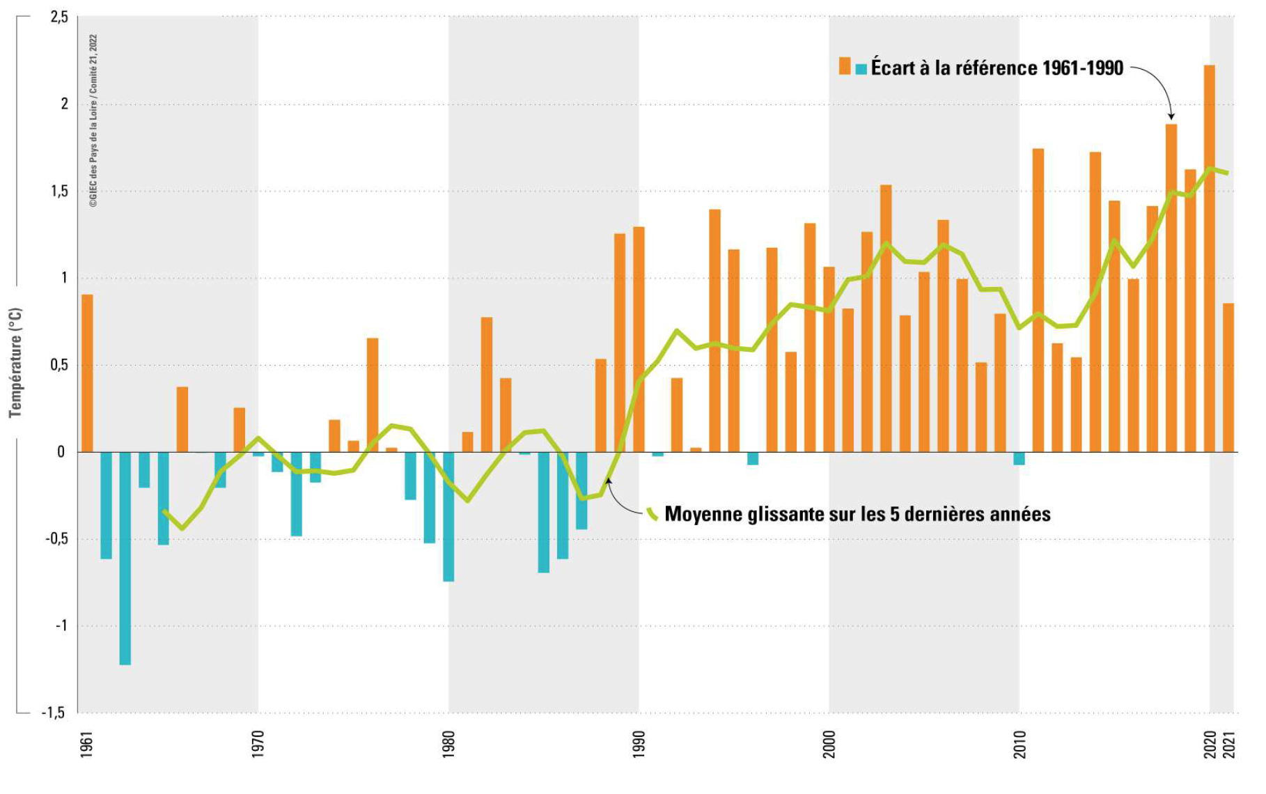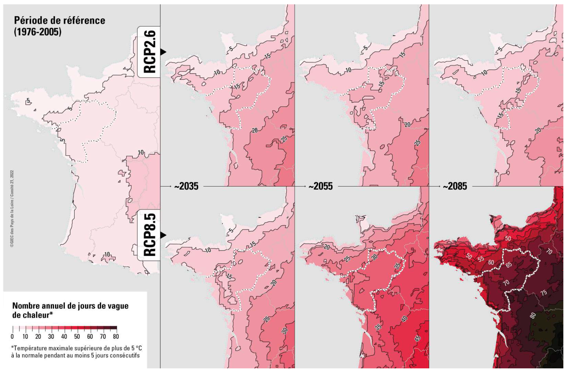 La conséquence la plus claire du dérèglement climatique dans la région sera l’augmentation des températures. Déjà, les relevés actuels font apparaître une élévation moyenne des températures d’environ 1,5 °C en soixante ans. Depuis 1980, on observe même une accélération du phénomène avec une élévation de la température moyenne de 0,37 °C tous les dix ans. Dans les trois prochaines décennies, l’élévation des températures restera peu sensible aux politiques d’atténuation. Dans le pire des scénarios, la hausse atteindra 2 °C à 2,5 °C en 2055. Avec une telle augmentation, Nantes et Angers afficheraient des températures annuelles moyennes équivalentes à celles de Biarritz sur la période 1976-2005. À plus long terme, les températures dépendront des réductions ou non d’émissions de gaz à effet de serre (GES). « Une réduction globale massive des émissions de GES pourrait, d’ici à 2100, ramener la hausse des températures ligériennes autour de 1 °C par rapport à la période 1976- 2005. Une politique de laissez-faire pourrait au contraire porter la hausse des températures de la région à 3,5 °C, voire à 4 °C », précise le rapport. Cette hausse moyenne des températures s’accompagnera de celle du nombre annuel de jours chauds, c’est-à-dire ceux dépassant les 25 °C. Une baisse brutale et rapide des émissions de GES permettrait d’en limiter le nombre entre 10 et 15 jours par rapport à la période de référence.