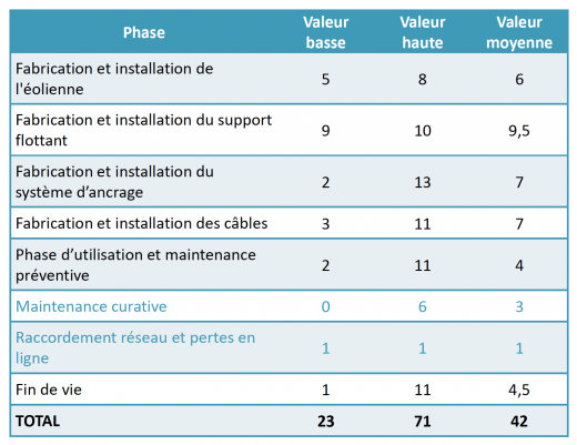 L’analyse des ACV des cinq fermes pilotes d’éolien flottant permet de voir une disparité importante. Ainsi, pour une durée de vie de vingt ans et des facteurs de charge de 35 à 50 %, l’intensité carbone des fermes peut varier de 23 à 71 gCO2e/kWh avec une valeur moyenne de 42 gCO2e/kWh. Si la phase d’extraction et de transformation des matériaux présente une contribution à l’intensité carbone assez similaire (entre 17 et 24,3 gCO2e/kWh) sur l’ensemble des projets, « la plus grande variabilité provient des hypothèses liées aux consommations des navires en phase d’installation, de maintenance et de fin de vie », souligne l’expertise.