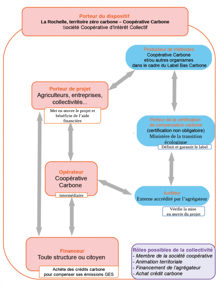 La préfecture de Charente-Maritime a lancé le 16 décembre 2020 la première coopérative carbone locale d’EuropeLes statuts de la coopérative ont été signés par la Communauté d’Agglomération de La Rochelle, la Ville de La Rochelle, Alstom, LEA Nature, le Crédit Agricole CMDS, Port Atlantique La Rochelle, Atlantech, Adefip et La Rochelle Université. Elle réunit des collectivités locales, des entreprises, des associations, des organismes de formation et de recherche et des citoyens. Elle a été créée pour aider le territoire à atteindre son objectif zéro carbone en 2040. Elle accompagne les porteurs de projets de réduction d’émissions tout au long de leur parcours. « Nous aidons les entreprises et les collectivités à mener un bilan carbone, à construire un plan de réduction de leurs émissions et leurs stratégies bas carbone. Par ailleurs, nous leur proposons de compenser leurs émissions résiduelles sur des projets locaux, que nous accompagnons aussi. Ils peuvent être portés par des bénévoles ou des associations ancrées dans les territoires », résume Anne Rostaing. En outre, cet outil coopératif permettra d’émettre et de vendre des crédits carbone sur un marché territorial pour réunir porteurs de projets et acheteurs. La coopérative agrège différents financeurs, qui peuvent choisir le projet sur lequel ils souhaitent intervenir. Le prix de la tonne carbone n’est pas encore fixé et le système à adopter est en cours de discussion. Cette année, l’objectif est d’atteindre une cible de 3 000 tonnes vendues pour un prix de l’ordre de 50 euros la tonne. Les études techniques, économiques, juridiques et le développement d’outils ont nécessité un investissement de 800 000 euros. Le coût d’amorçage de l’agrégateur est estimé à 1 million d’euros pour les trois premières années.