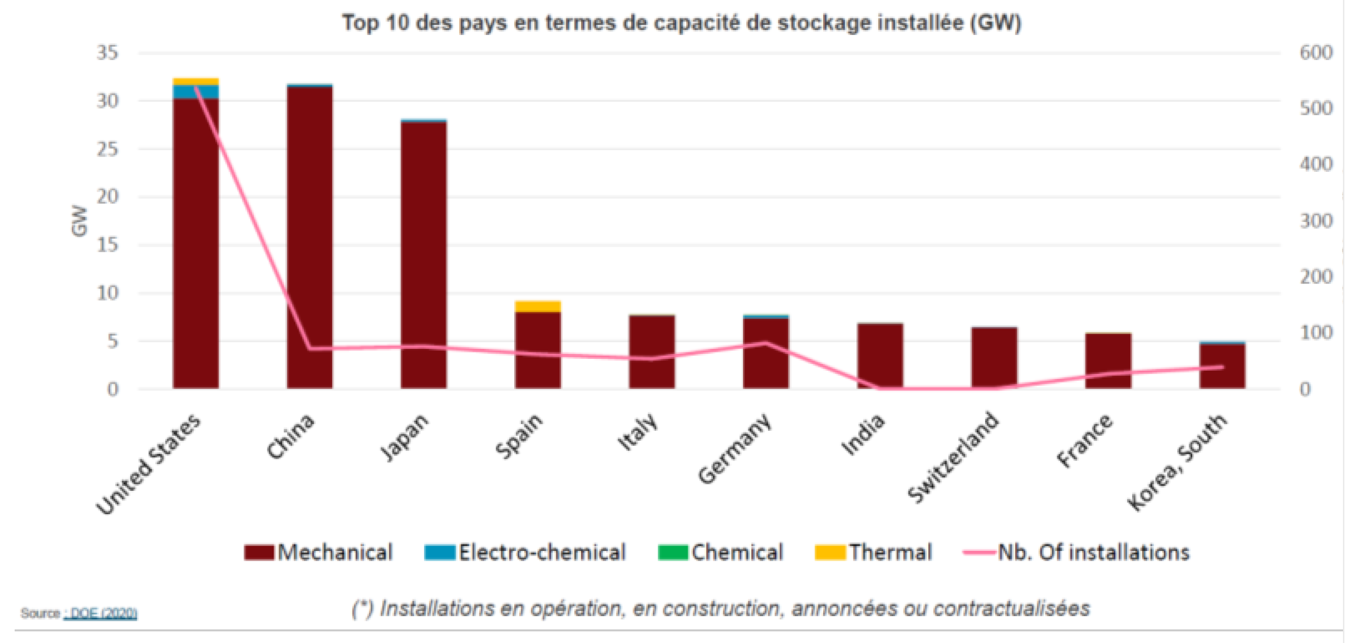 Avec le pilotage de la demande et les interconnexions électriques, le stockage d’énergies et ses différents dispositifs sont une des solutions d’ajustement et d’équilibre. Selon les bases de données DOE (US), près de 200 GW de capacités mondiales de stockage d’électricité étaient recensés fin 2020, dont plus de 92 % étaient couverts par des stations de transfert d’énergie par pompage (Step). Mais ces chiffres devraient vite évoluer. L’European Association for Storage of Energy estime le besoin de stockage d’énergie à près de 200 GW pour le Vieux Continent en 2030 et jusqu’à 600 GW en 2050. Cela nécessite le déploiement de près de 14 GW de capacité par an, bien loin du rythme annuel actuel de 1 GW…
